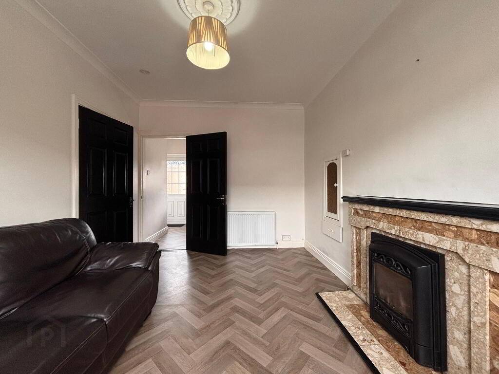 4.20m x 3.00m Laminate flooring with a stove insert and large window overlooking the front.