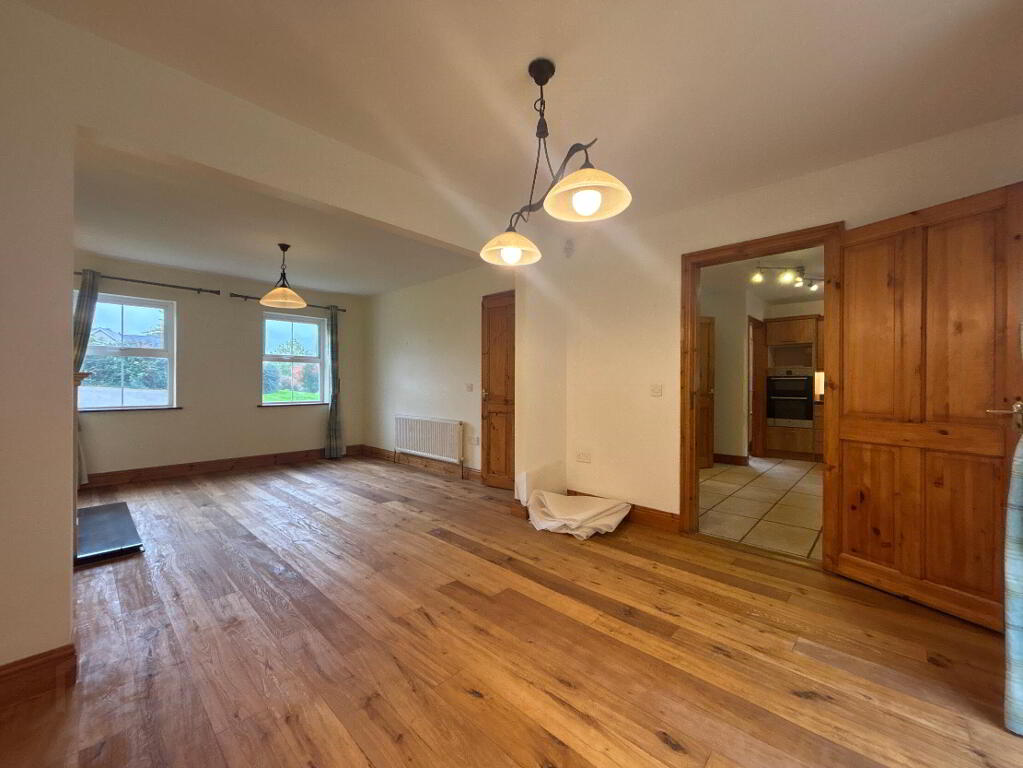 6.90m x 3.80m Sitting room and dining with hardwood timber flooring, double doors to the rear and a stove insert with granite surround.