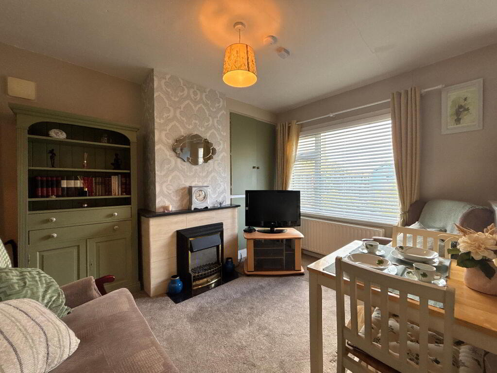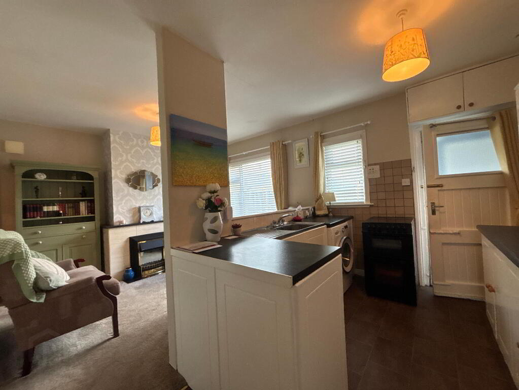 3.40m x 4.95m Mixture of tiled and carpet flooring with a tiled backsplash and units at eye and floor level. There is a large window overlooking the rear garden along with a gas fire.